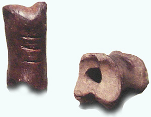 Een teenkoot van een onvolgroeid rund, voorzien van drie kerven. Dit niet ingeboorde stuk diende als speelkoot.