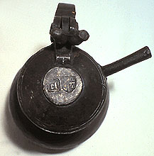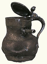Een tinnen pijpekannetje, uit de periode 1450-1500, had duidelijk in de verdrukking gezeten. De hoogte is 11,3 cm. De diameter waar het tinmakers merk is ingeslagen is 3.5 cm.