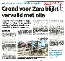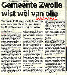 Dat velen niet gelukkig waren met de bouwplannen is te lezen in de Stentor van die tijd. Dat er nog een ander groot probleem om de hoek kwam kijken begon met enkele artikelen in o.a. de Stentor “Grond voor ZARA blijkt vervuild met olie” en in de Swollenaer, “Vondst olie is tegenvaller bij bouwrijp maken locatie voormalige bibliotheek”. Na het lezen van die artikelen steeg bij mij de bloeddruk en heb ik een bevriende journalist gebeld met het verzoek om deze kwestie aan de kaak te stellen. Ik vertelde dat op mijn site onder het hoofdstuk “Bibliotheek” ik de verontreiniging en de daaruit voortvloeiende problematiek al jaren geleden beschreven had. Toen hij dat bekeken had was zijn vraag of ik de originele foto’s nog had. Tuurlijk heb ik die nog en heb hem die toegezonden met ook de namen van getuigen die toentertijd samen met mij in de bouwput aanwezig waren en de olieverontreiniging gezien hebben. Onder die personen de latere wethouder van Zwolle Jaap Hagedoorn en de fractievoorzitter van de VVD Dirk v/d Schrier. Ook zij waren toen niet bereid om mij te steunen. De toen al verontreinigde grond uit de bouwput werd gedeeltelijk gestort bij de zandwinningplaats in de Sekdoornpolder zoals u hierboven in het artikel al hebt kunnen lezen. Verdere verdieping van de grond in de bouwput werd toen niet gedaan. Betonvloeren bedekten iets dat toch nooit meer in het zicht zou komen! Dacht men! Dat ik de grond in de zandwinningsplaats heb zien liggen komt omdat ik daar in mijn eigen tijd, omdat niemand anders daar de noodzaak van in zag, met de metaaldetector bezig ben geweest. Toen de heren van “bijzondere wetten”, na hun bezoek aan de bouwput de volgende dag daar een kijkje namen, was alle verontreinigde grond op die plek al weggehaald!!