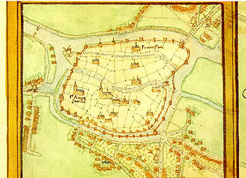 1600 weergegeven voor zover die bekend is en op vele plaatsen nog te zien is op de afgebeelde kadasterkaart van 1832 (dik zwart en stippellijn). Op plaatsen langs de