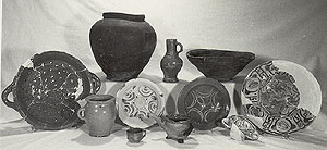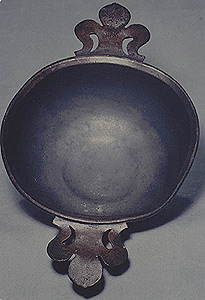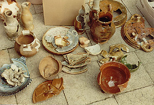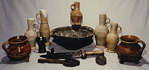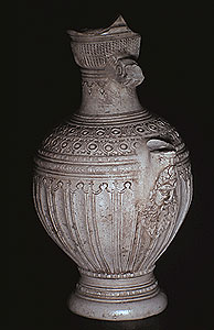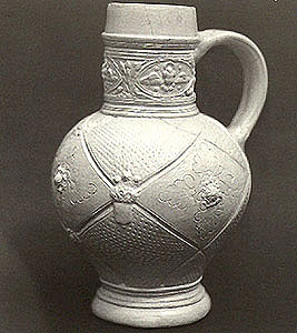 Links een fragment van een Siegburger Tüllekan en rechts een sierkan die waarschijnlijk uit Siegburg/Westerwald afkomstig is. Beiden kunnen gedateerd worden 1600 of eerder. | ||