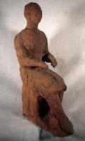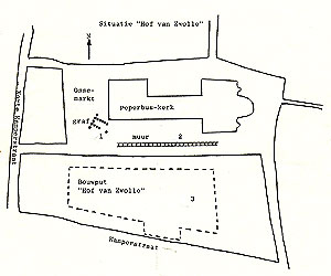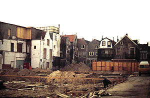 Tijdens de sloopwerkzaamheden werd links achter in de hoek het atelier van de kunstenaar Van der Wiele weggehaald en kwam dit 26 cm hoge beeldje van geknepen klei te voorschijn. Ter oriëntatie: links op de afbeelding de achterkant van de huizen die aan de Kamperstraat staan. Rechts voor de auto de Halve Maansteeg-Korte Kamperstraat. Rechts buiten de foto staat de Peperbus en kerk. |