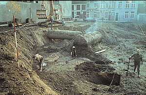 Opm. 2010: Toen de bouwput werd gegraven zijn er een aantal olietanks verwijderd. Deze olietanks, bleken lek geweest te zijn en in al die jaren is de weglekkende olie in de grond verdwenen. Tijdens de opgraving stonden er steeds meer plassen olie in de bouwput en was de grond op een bepaald moment doordrenkt daarvan. Door de stank kreeg ik steeds meer last van hoofdpijn. Op de foto waar de rode auto opstaat is de grond vergeven van de olie! Op mijn vraag of de grond niet gesaneerd werd kreeg ik geen antwoord. Volgens de uitvoerders was het geen olie! en men maakte aanstalten om de fundering er overheen te gaan leggen! Ik vond dat niet verantwoord en heb daarom bij de politie een melding gedaan. Twee man van de recherche kwamen in de bouwput polshoogte nemen. Op dat moment heb ik met een poetslap de olie aangestoken. Daarbij was o.a. ook de prov. Archeoloog Ad Verlinde aanwezig. Hij schrok, en hij niet alleen, van de enorme vlammen en rookwolk die daardoor ontstond. |