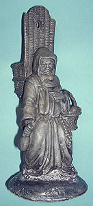 was maar toen ik het in handen kreeg was het heel iets anders. De monnik heeft een drinkkruik in zijn rechterhand en draagt een rozenkrans. Een mand met etenswaren/appels?