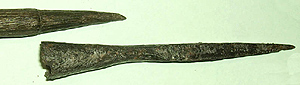 Op de afbeelding is de 8 cm lange ijzeren pijlpunt te zien en het rond gesneden begin van de schacht dat in het huis