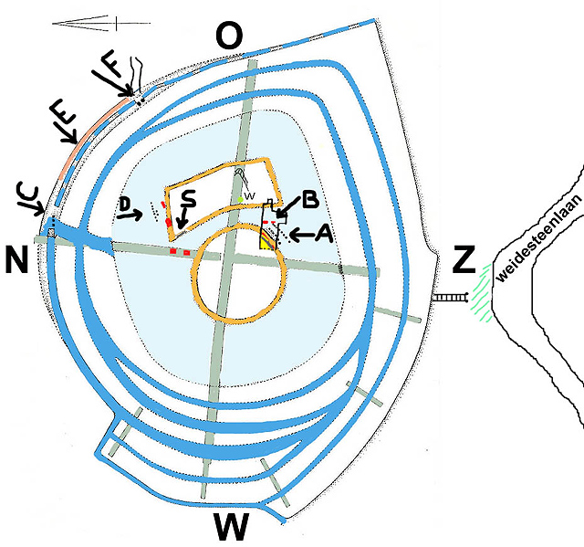 Hier de opgravingtekening van de provinciale archeoloog A.D. Verlinde met de aanvullingen van mij. Tevens heb ik de tekening meer kleur gegeven voor de duidelijkheid