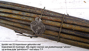 De ongeveer 8mm dikke geelkoperen staven waren in bundels van 25 stuks verpakt. Ze hadden een lengte van 90-100cm. Bijeengebonden met koperdraad en wogen 15 kilo. Aan het koperdraad waren loden bevestigd met aan de ene zijde de afdruk van een dubbel koppige adelaar en aan de andere zijde een palmboom? En de letters TP. Van de loden kon ik alleen maar aangeven dat die dubbel koppige adelaar mij deed denken aan het Habsburger wapen maar er zijn veel