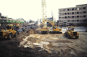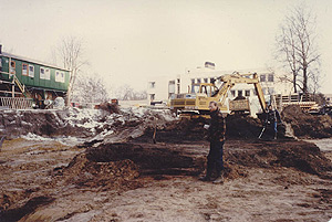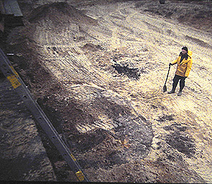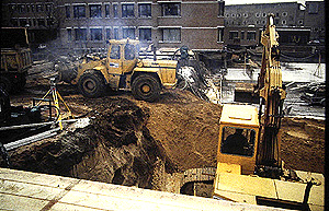 bouwput archeologisch begeleidden. Modderpoelen zorgden ervoor dat de wagens van het sloop- en zandbedrijf onherkenbaar werden. Personen die lopend hun werk moesten doen