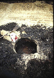 waarbij een grond-verstoring te voorschijn kwam, met daarin enkele zogenaamde kogelpotscherven, was de belangstelling nadrukkelijk gewekt. Dit deel van de bouwput leverde