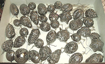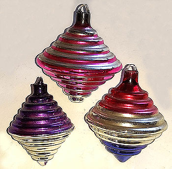 Hier een collectie kerstballen die rond 1830 gemaakt zijn in Bischofsgrün. Deze versiering is gemaakt uit 1 stuk glaspijp en verspiegeld met tin.